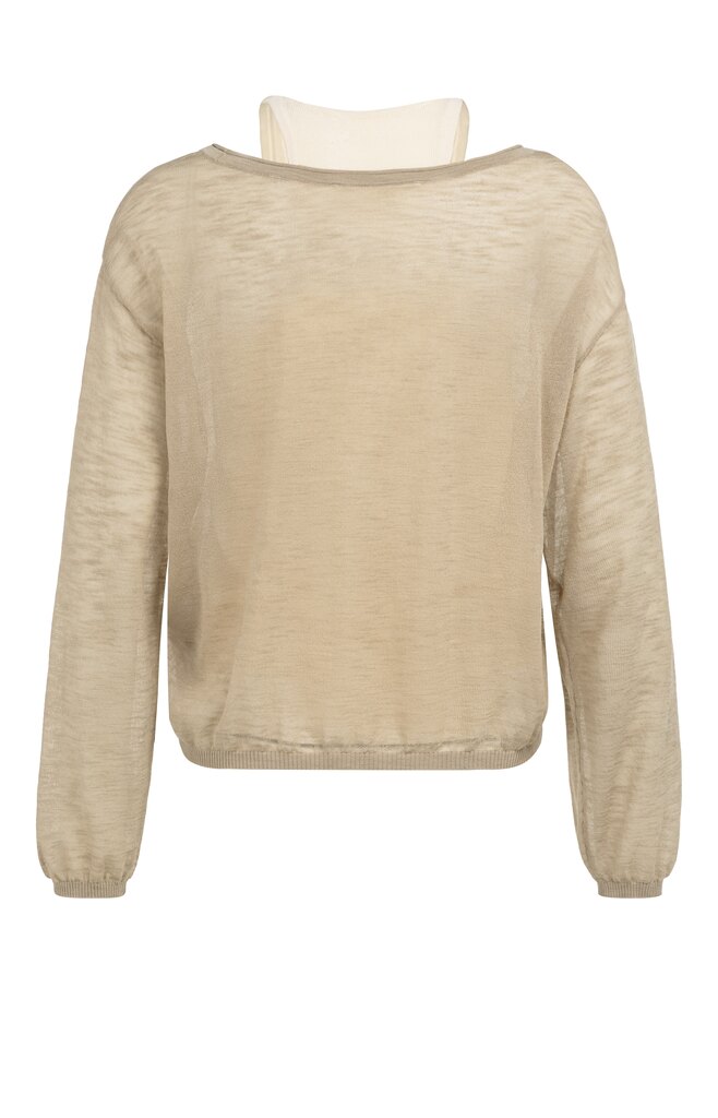 Deze twinset bestaat uit een fijngebreide trui met lange mouwen en een bijpassende singlet. De trui heeft een boothals, een oversized pasvorm en elastische boorden aan de mouwen en zoom voor een subtiel bloezend effect. De singlet kan zowel samen met de trui als afzonderlijk gedragen worden. Een veelzijdige set met een verfijnde uitstraling.
