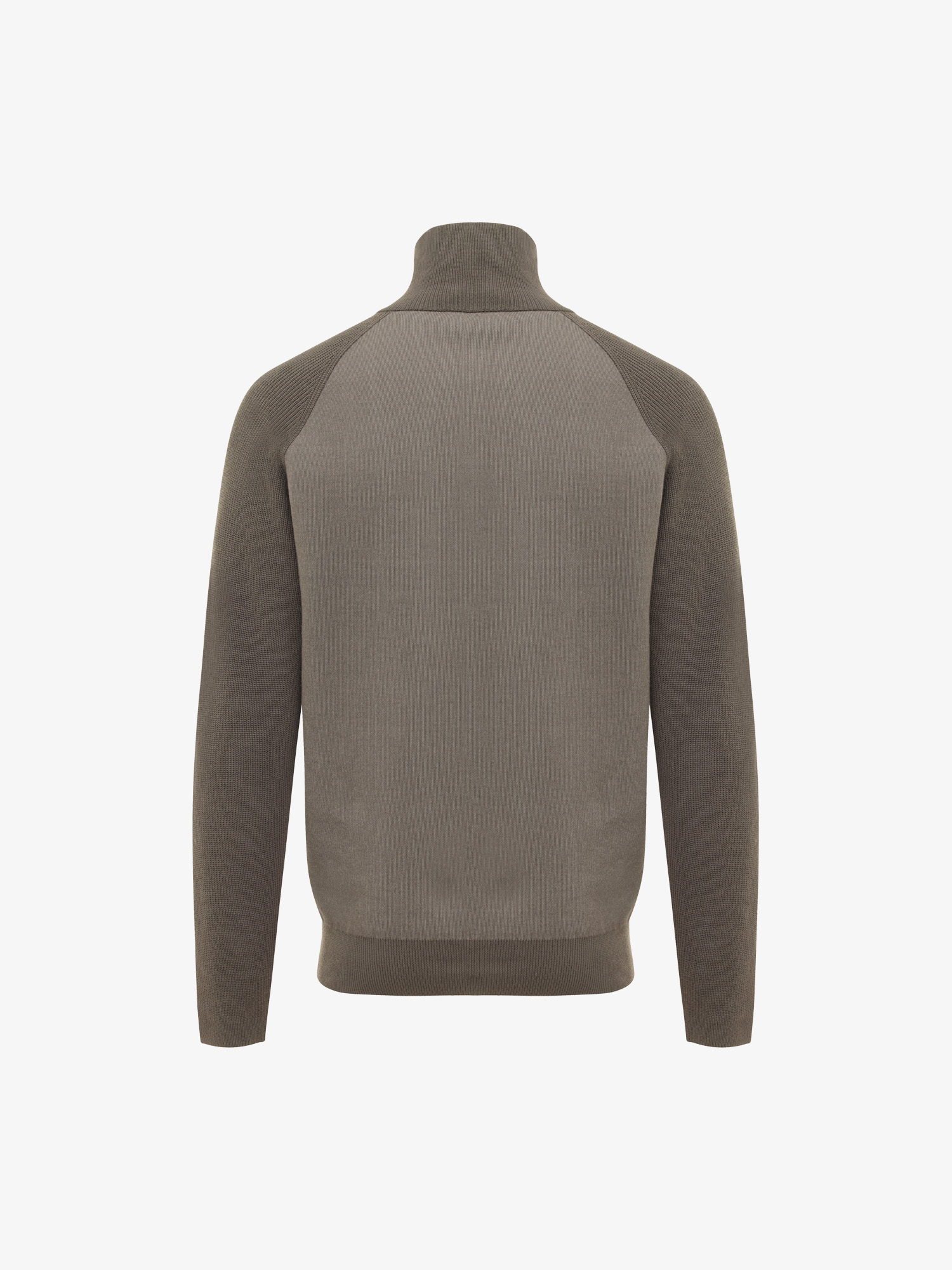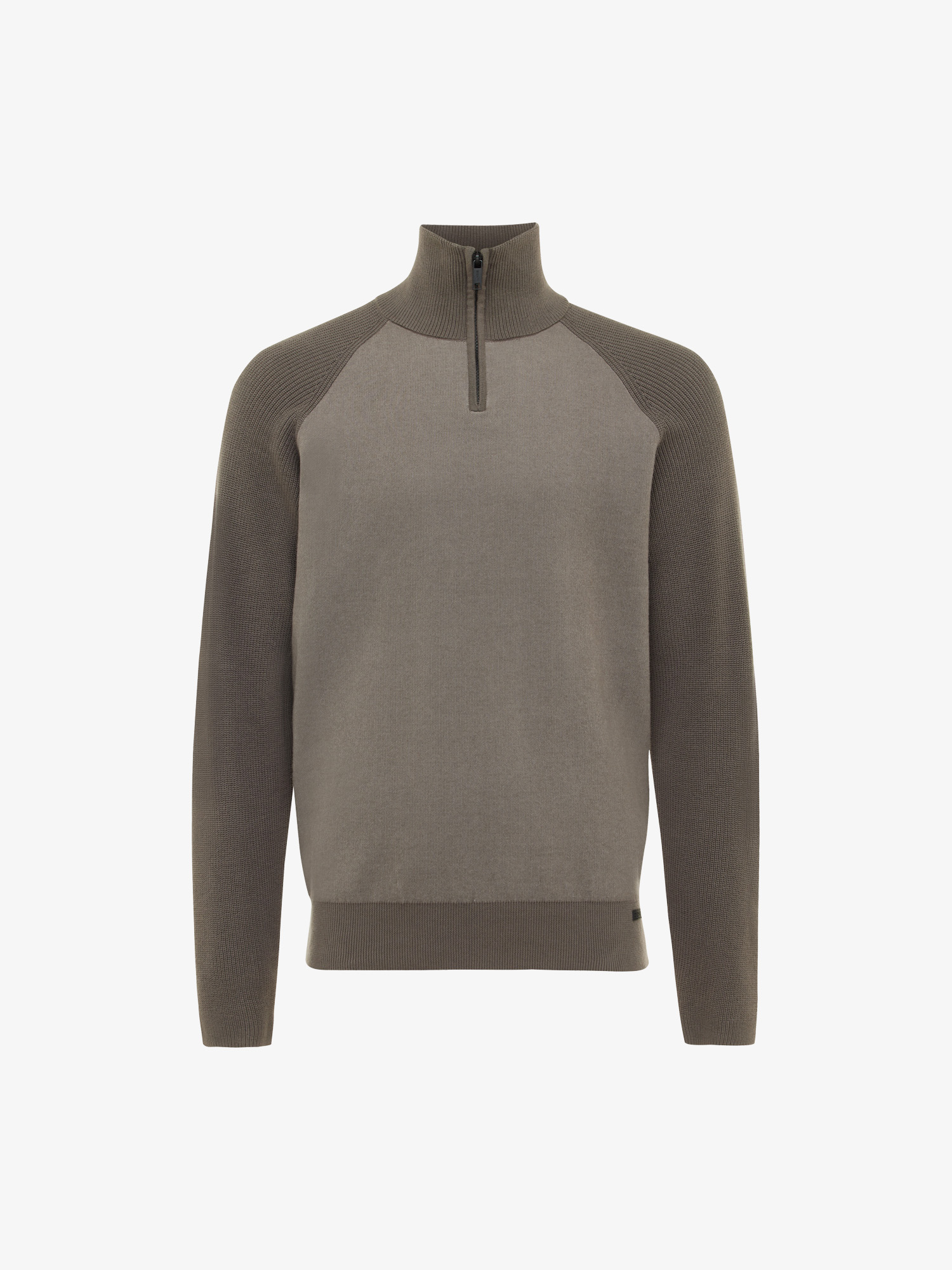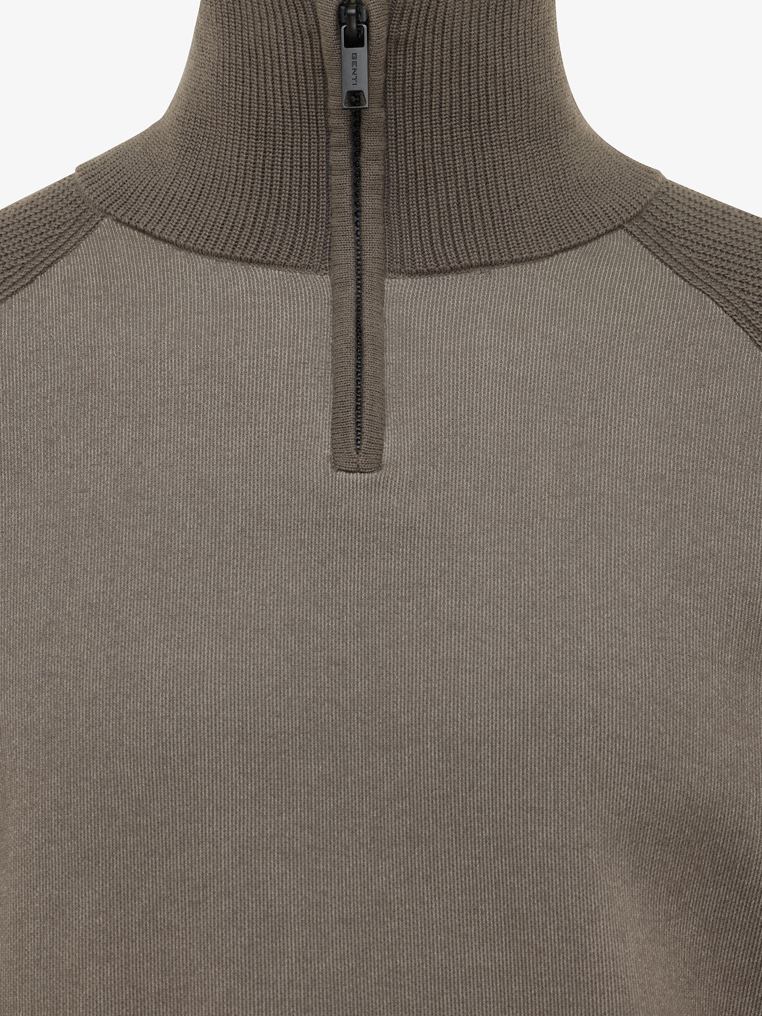Bruine turtle zip met een mix van twee steekstructuren voor een subtiel contrast in textuur, vervaardigd van 100% katoen voor een stevige feel en een comfortabele fit