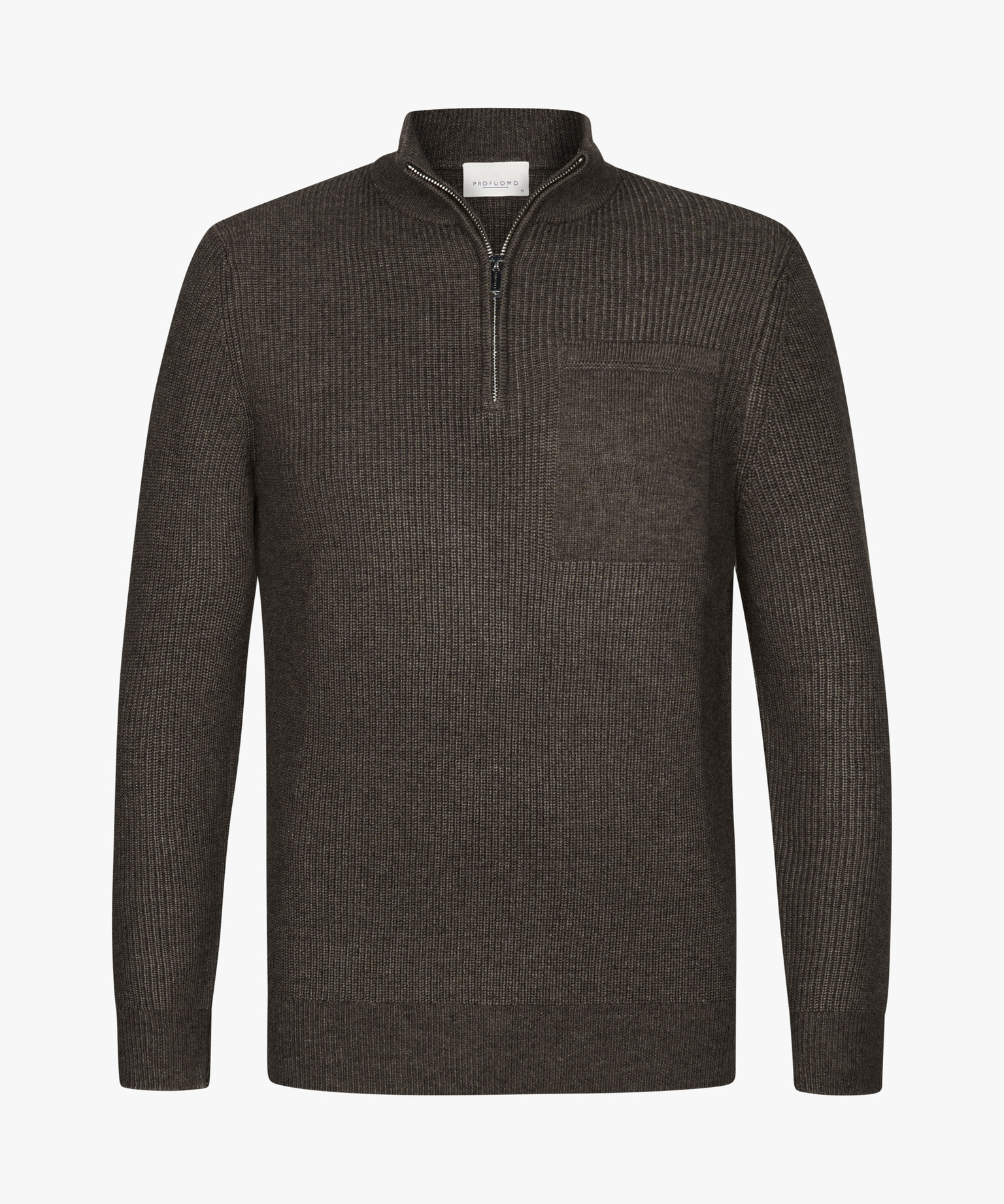 Deze zip trui in het Bruin is gemaakt van 50% Polyester, 30% Katoen en 20% Wool