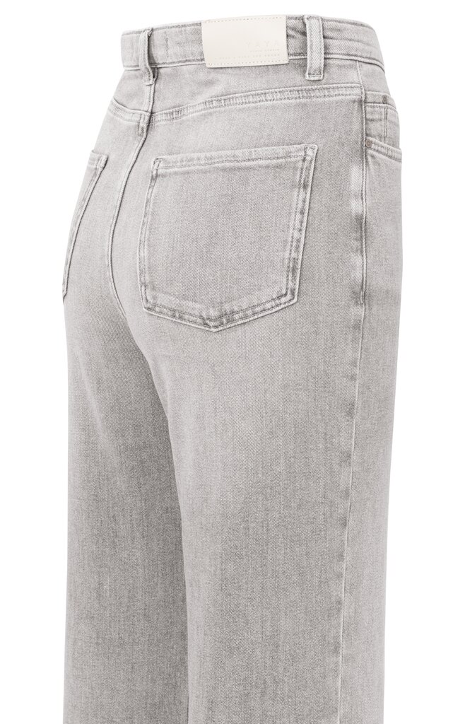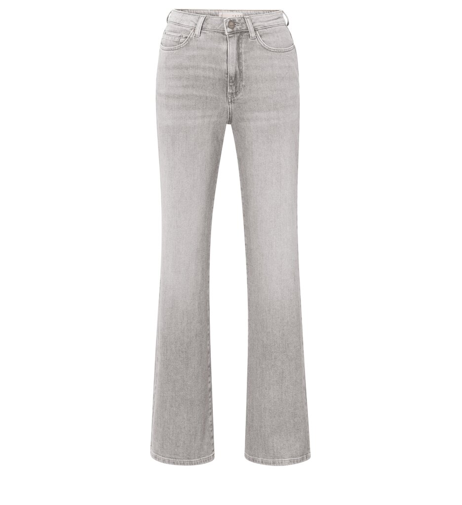 Deze jeans heeft een hoge taille en lange, wijde pijpen voor een elegante en normale pasvorm, voorzien van vijf zakken en een subtiel label achter op de tailleband.