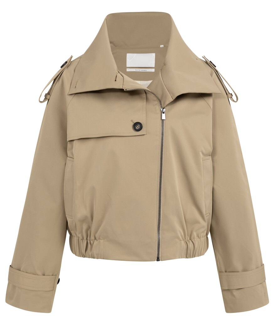 Dit korte jack combineert trenchcoat-elementen met een bomberstijl, ontworpen met een opstaande kraag, epauletten en een schouderoverslag voor een functionele look, de elastische tailleband en manchetten zorgen voor een modern accent