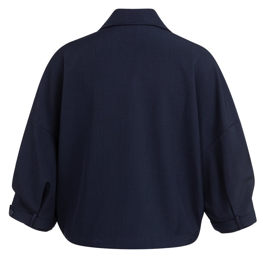 Dit blauwe blousejack heeft een oversized pasvorm met verlaagde schoudernaden en een klassieke kraag. Voorzien van een knoopsluiting, klepzakken met knopen en wijde mouwen met verstelbare bandjes. De taille is aan te passen met een trekkoord, wat zorgt voor een vrouwelijk silhouet.