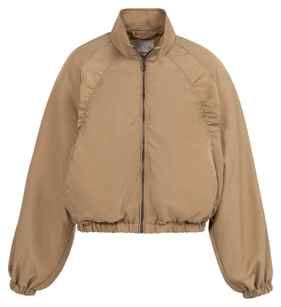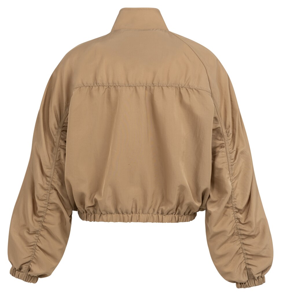 Dit korte jack is gemaakt van een gladde, lichtgewicht stof en heeft een oversized pasvorm. Het ontwerp is voorzien van een opstaande kraag, lange mouwen met zachte plooidetails en een ritssluiting aan de voorkant. De elastische boorden zorgen voor een sportieve touch. Een modern en casual item, perfect voor het tussenseizoen.